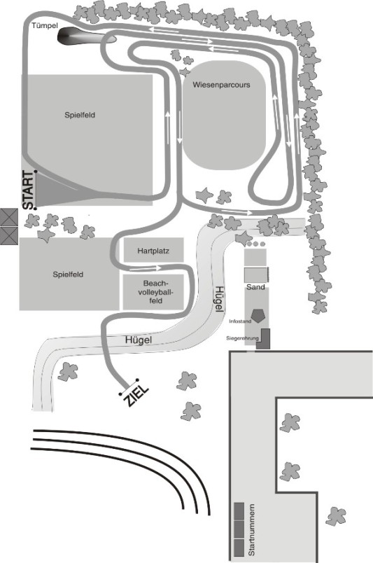 Rundenlängen: Startrunde ca. 1 km, Seniorenrunde ca. 1,1 km, Zieleinlauf ca. 100 m